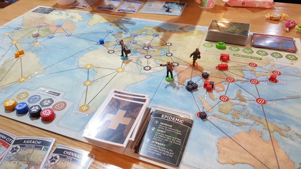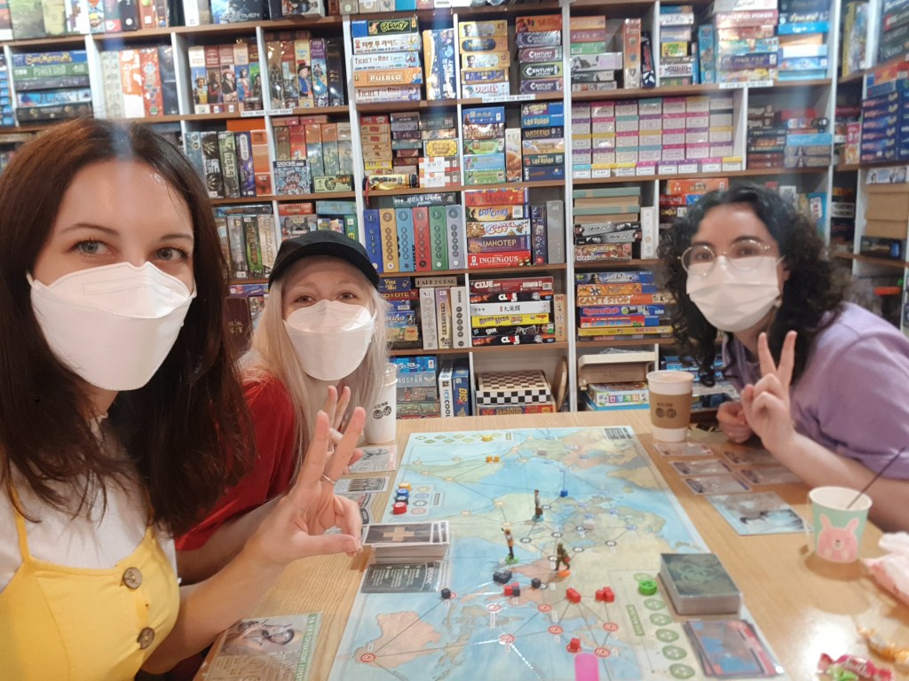 The selection here was pretty good! I’m not sure that all the games have English rule books so you can play it safe by picking a game you know well, or it’s really easy to download a pdf copy of the game rules online to read through on your phone. When you want to play a game, call over a member of staff and they will bring the game and set it up on the table for you. We opted to play a nice co-operative game of Pandemic to kick things off. Surprisingly we won two times (!?!) which makes me feel like we were playing it wrong as I never normally beat it, but we felt pretty proud of ourselves regardless. They had the 10th Anniversary Edition with the metal case and nice figures, and all the cards had English which was nice and convenient as we didn’t need to rely on dodgy translation apps.