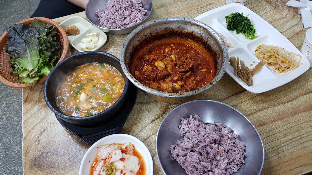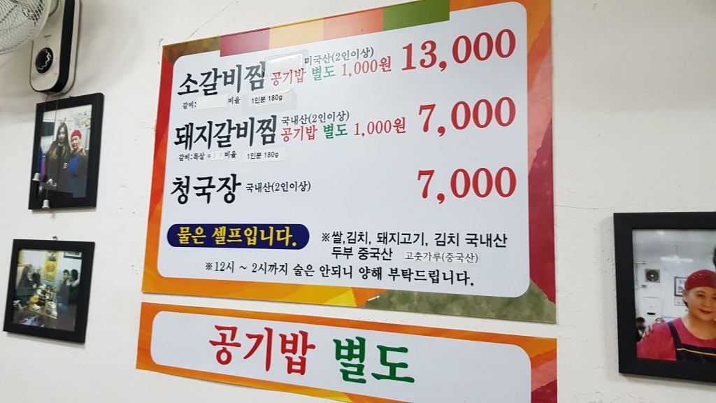 They had both beef and pork galbijjim, with beef being 13,000 each with a minimum of 2 orders (so 26,000 for two people) or pork at 7,000 each with a minimum of 2 orders (14,00 for two people). We went with the pork and a portion of cheonggukjang (a kind of fermented soybean soups, it’s a bit stinky but tastes so so good). Rice was 1000 per portion, we went through 3 or 4 in the end.