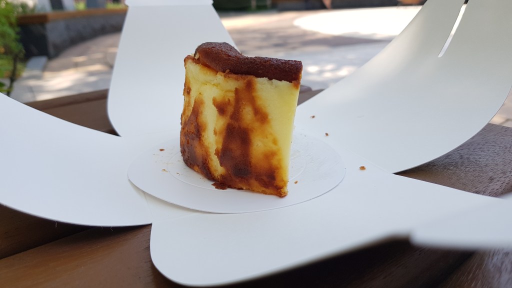 I found the basque cheesecake in one of the cabinets and was a wee bit shocked at the price, 9,900 for a slice or 26,000 for a whole cake. I’m a bit of a cheapskate so don’t usually splurge on stuff, but the pics online had tempted me and I was already there so… I went for it. He packed it up in a fancy bag and I took it as take out to have in the park (with a cheap coffee from Monster haha). He asked me how many forks I needed. Hahaha. One please. All for me.