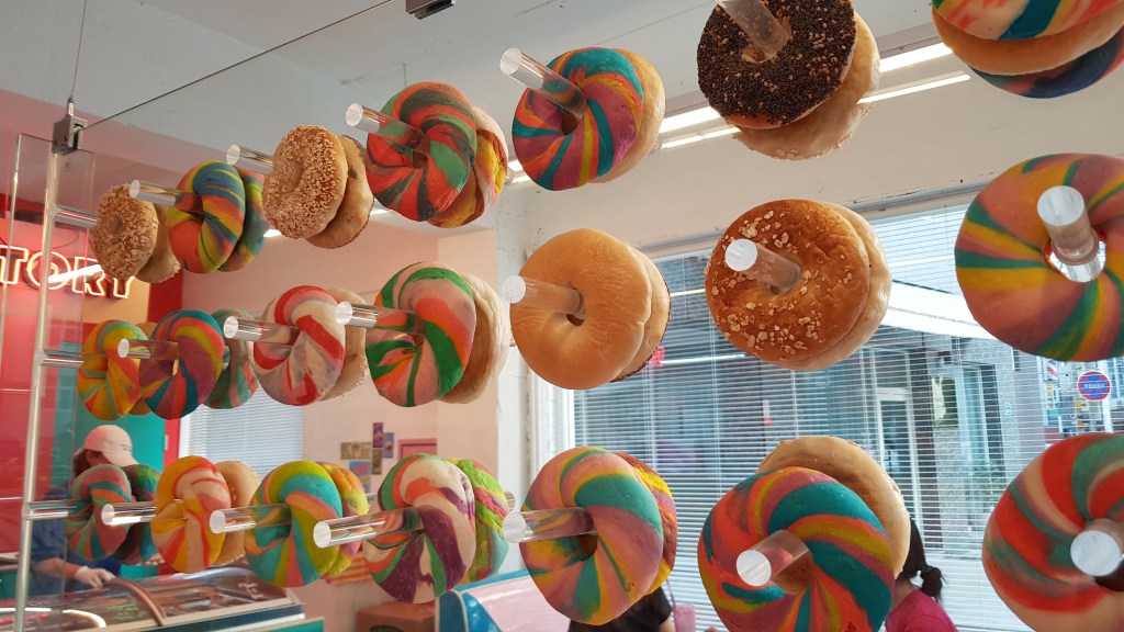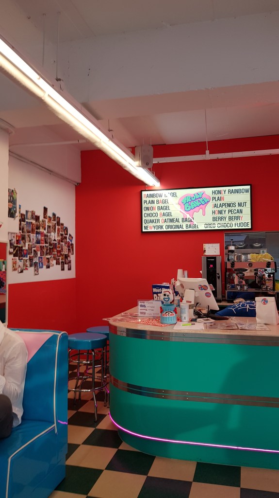 So as I’ve mentioned before I’m a bit of an Insta addict, and knew I’d have to try this place after several friends popped up on my feed eating these magical rainbow bagels. So after visiting the board game cafe with a few friends on a Sunday afternoon, we fancied a little snacky snack as we were peckish from all the gaming. It was time to finally try Truly Baker!