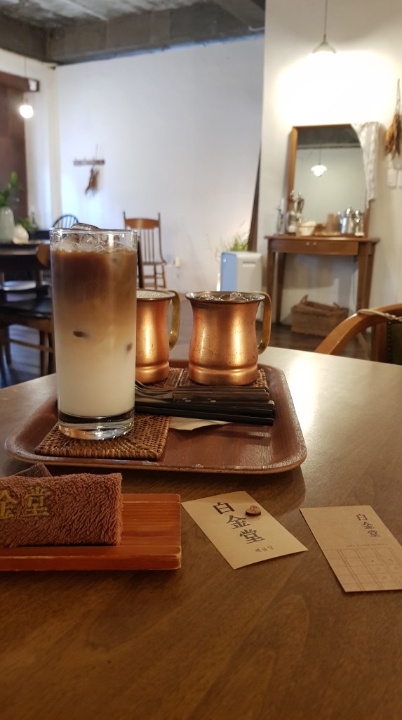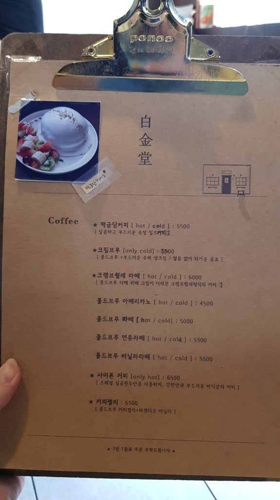 I tried the iced Baekgeumdang coffee for 5,500. It was sweet and milky and a nice change from my usual Iced Americanos haha. We also ordered the fruit pancakes (13,000) to share. They told us that we would have to wait 15 minutes for the pancakes, which was fine as we wanted to take pics anyway. They brought out the drinks first, then the pancakes. The pancakes were light and fluffy and freshly made, so still warm! They were covered in a cream that wasn’t too sweet, and seved with a variety of glazed fruit. It was my first time trying Korean style pancakes (I know they’re pretty popular right now!) and I enjoyed them! Definitely a sharing size, especially after all the dim sum we ate haha. If you’re ever in the area I hope you’ll stop by this cute little cafe and enjoy it as much as I did!