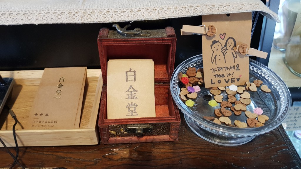 When you enter you’ll be at the cash register. The menus are in Korean so you’ll need to know coffee Korean or have a translation app to order. They do a range of coffees and speciality milk teas and flower teas, loads of unique choices! The staff are very sweet and kind so don’t worry about asking them for help. You can also take one of their cute business cards or a little wooden heart for free from the cash register! After we ordered we had time to explore the other rooms before sitting down.