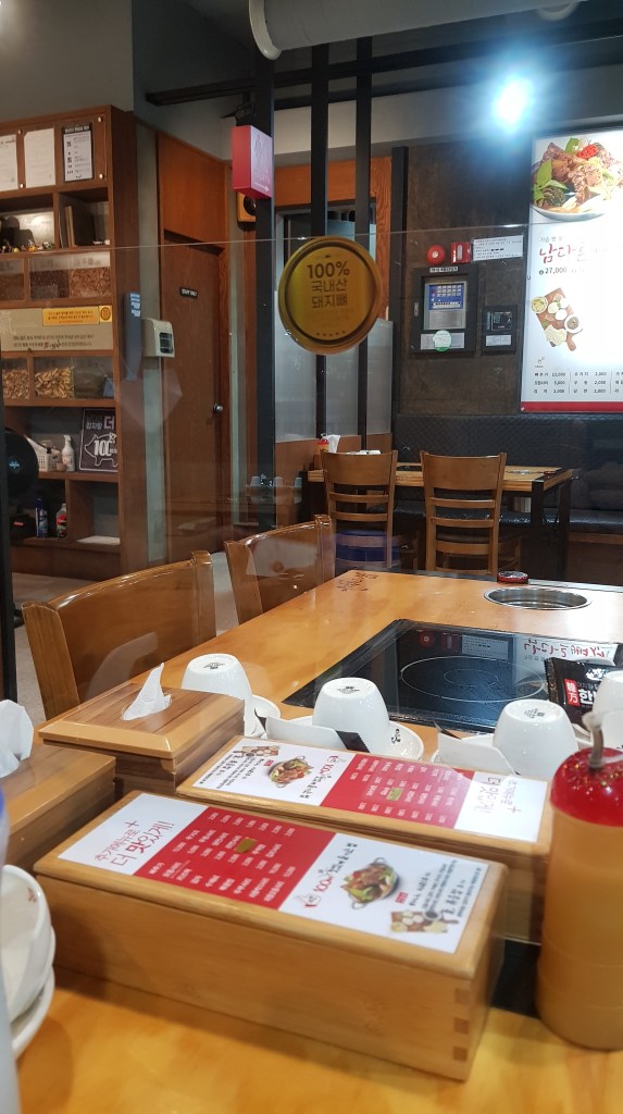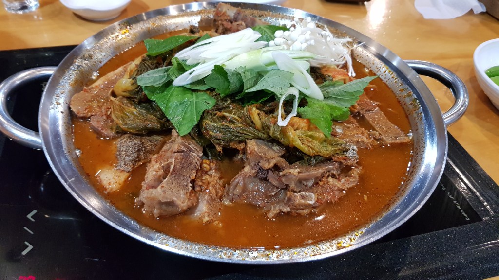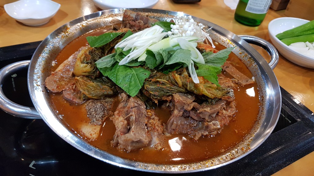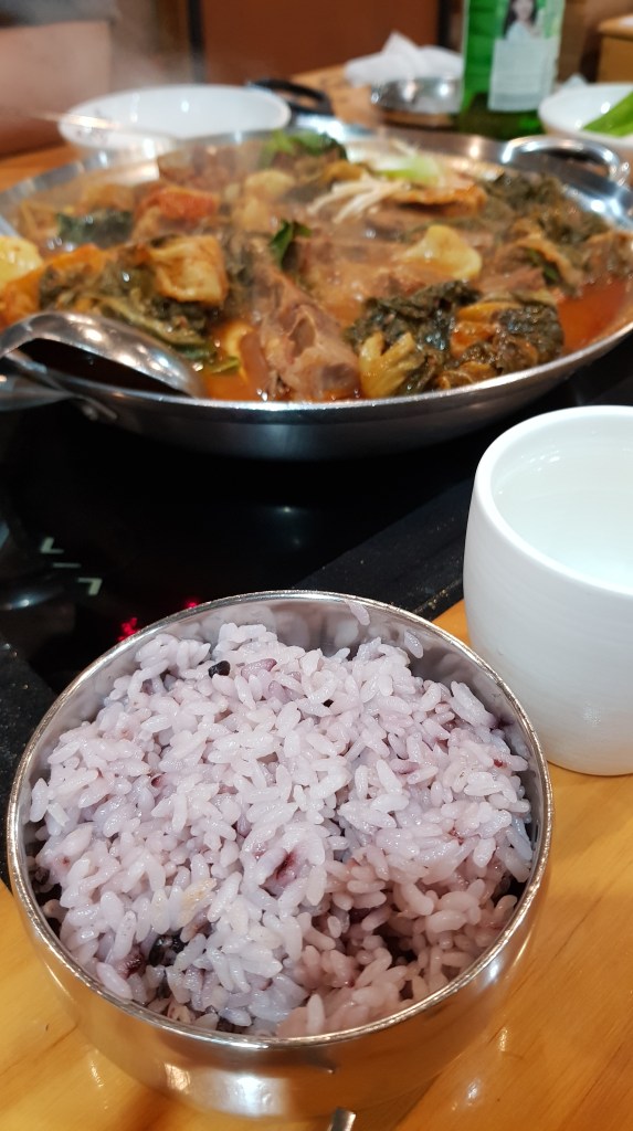 So one evening during my vacation me and the boyfriend decided to head out to Sangin-dong for dinner one night. This year we’ve had heavy rains all throughout summer, but on this day we got lucky with a break from the downpour. We hopped on the subway and went the few stops to Sangin, exited the subway to pouring rain 😂 Nothing beats a hearty meat soup on a rainy day, so we headed to the nearest Namzatang for some gamjatang as this chain is a safe bet for taste, what you need when you don’t want to stumble about in the rain looking for a restaurant!