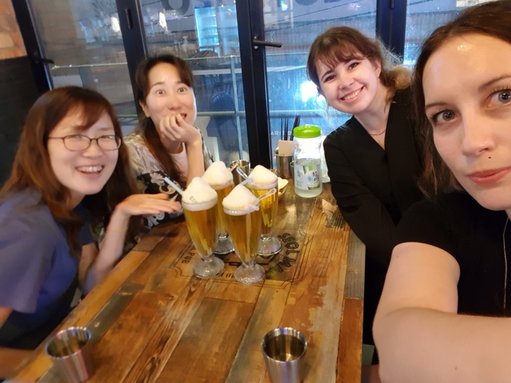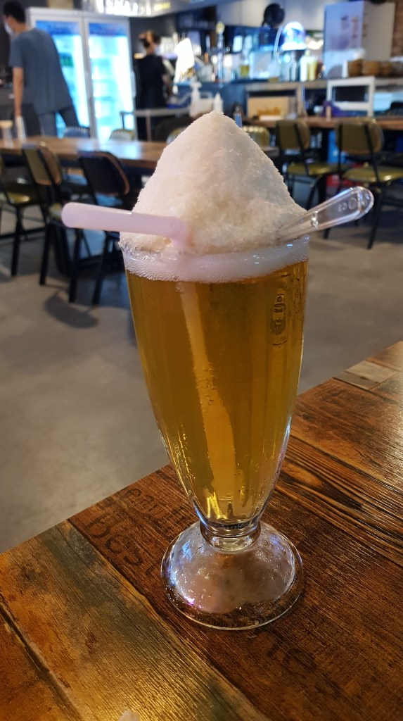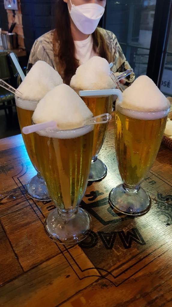 After we finished up eating we decided next round should be a beery one. Luckily, the floor above us was a pub! So we headed out and up the stairs (left hand side if you’re facing Hoeseonggak) to Seol Mac. They have a speciality beer, which is like a bingsu shaved ice made from beer, served as a topping on beer! Of course we needed a round of those! The beer shaved ice was super tasty but eat it quick before it melts!