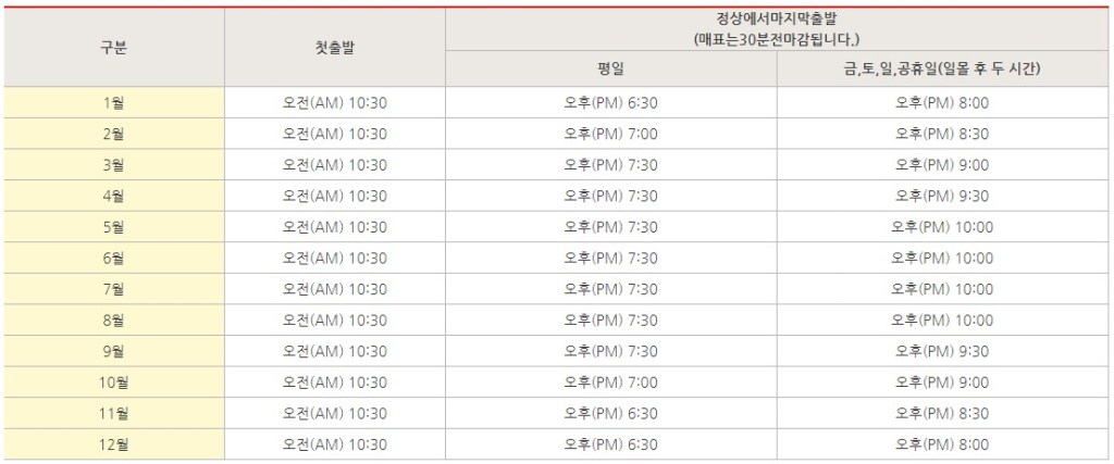 The hike up Apsan is super nice, and I’ve done it several times, but on a week night after work nobody wants to tire themselves out with that! So we opted to take the cable car up. The cost is 10,500 per person (adults, 7,500 children) return trip. The last cable car down depends on which month it is and whether it is a weekday or weekend. The table is below if you want to check the schedule before going. The ride only takes a few minutes and drops you at the observation tower. There’s a cafe and restaurant at the top too, but we took a picnic 🙂