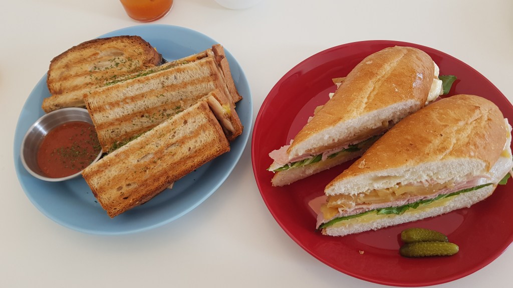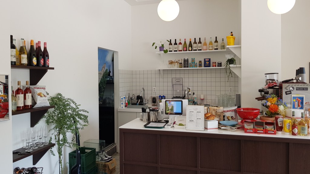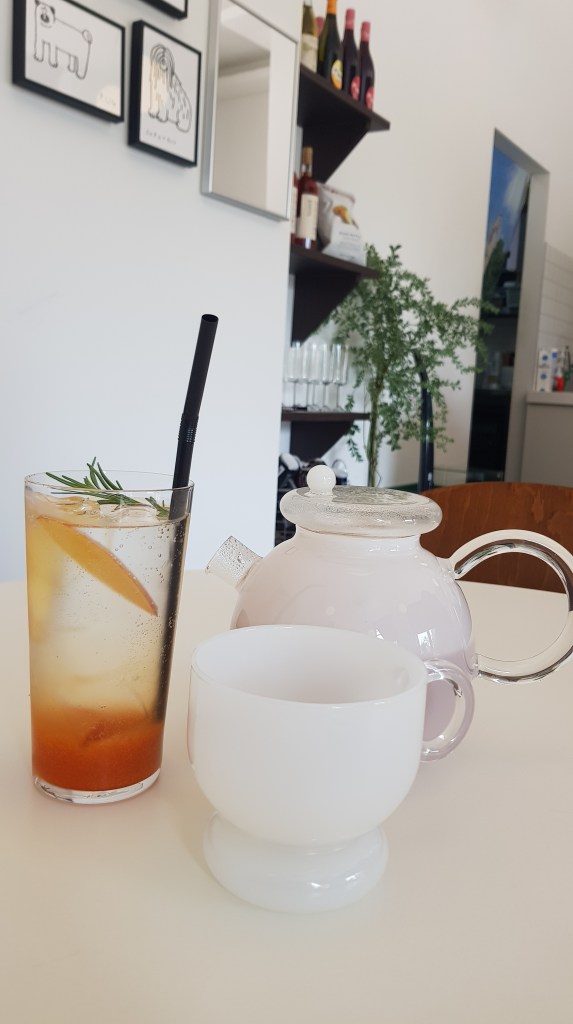 Inside the decor is fresh and modern with some cute artwork pieces and plants. There’s several tables inside also. We went at 11 on a Saturday morning and it was fairly busy so if you come later in the day you might have to wait. Luckily it opens at 10am so perfect spot for an early brunch if you get there early! The staff spoke English (always a nice bonus) and brought us a menu, told us about the soup of the day, and asked us to order at the counter when ready. The menu choice isn’t huge but there’s a selection of sandwiches, pastas, and nice selection of drinks too!