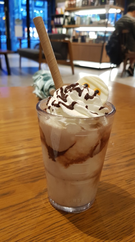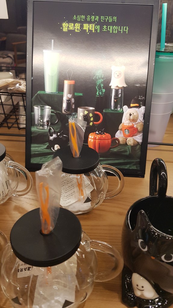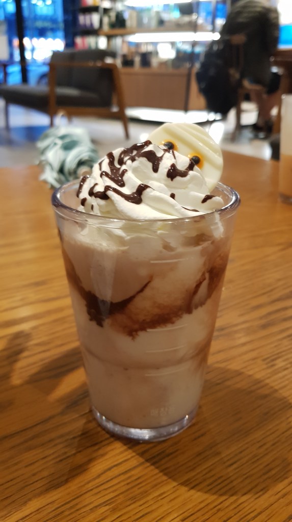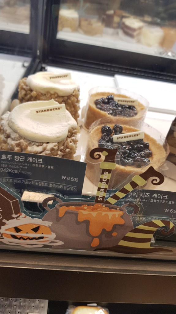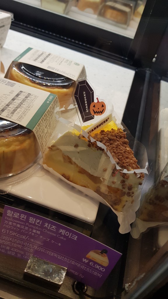 There are no shortage of Starbucks in Daegu (or Korea, or the world for that matter) so I’m sure if you want to try the autumn range of offerings you can find one nearby. Just slap it into Naver and one will pop up, I’m sure. The Halloween/autumn ranges includes a few different drinks and snacks, as well as collectible tumblers and other offerings. We tried a few items, but there are more in the range that you can see here (Starbucks is expensive, I’m not gonna buy literally every menu item. I’m a teacher, not a BitCoin trader). So look below to see what we tried! DISCLAIMER: I can’t compare these items to those back home or anything, like I said I’m not big into Starbucks, but I had fun experimenting with the new range of stuff anyway!