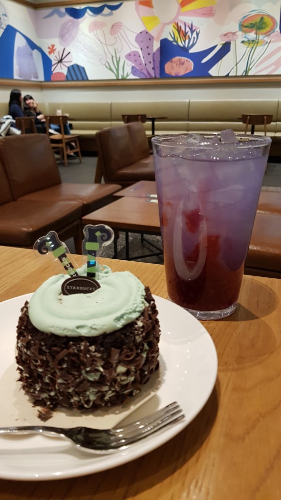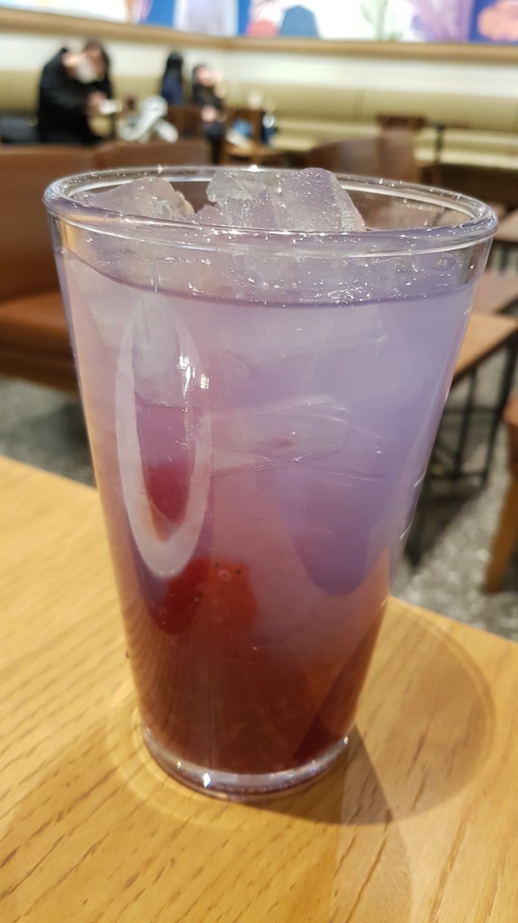 So I actually went back on another day to try this because it looked so cool in the adverts. I was quite sad that it was just served in a regular glass with ice, minus points boo!!! This wasn’t my favourite to be honest. It was fine but I think a regular ade would be better. The taste was a little too sweet for me. I think it might be grapefruit and purple…? I didn’t actually check haha. But I would opt to try the other drinks before this one.