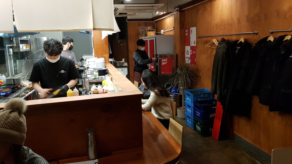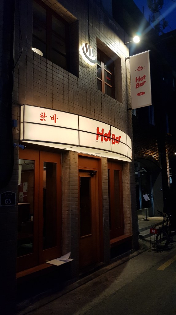 Anyone who knows me well knows I’m a sucker for some fancy bar food and soju on a Friday night, so when I saw Hot Bar pics I knew I had to go. Located a little north of downtown, and a short walk from Jungangro Station, Hot Bar is located in the neighbourhood behind where Novotel used to be. This neighbourhood has really been up and coming the last few years (hooray for gentrification? haaaa, I jest) and has seen a huge growth in trendy bars and restaurants opening up. Hot Bar is one of these and is a great little spot for a few drinks and snacks on a night out! Read on to see more.