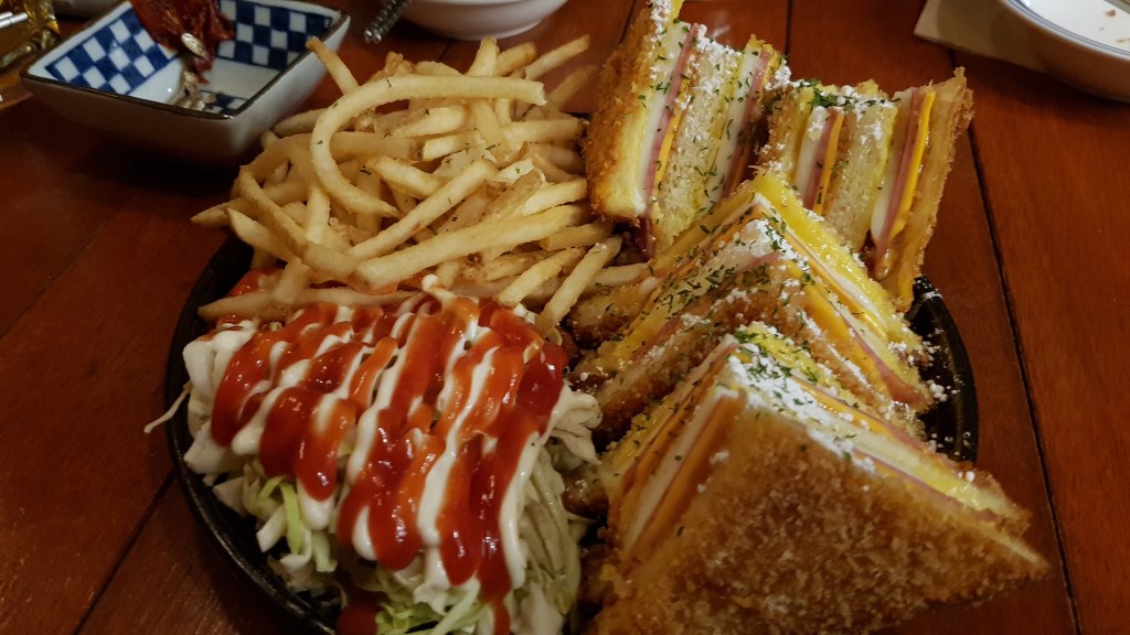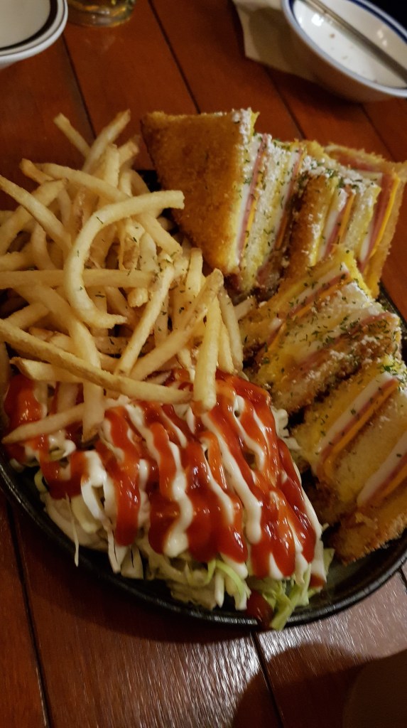 We ordered the salmon futomaki (연어후토마끼) 18,000 won, monte cristo sandwich (몬테크리스토 샌드위치) 16,000 won (including fries), Korean meat pancake (육전) 15,000, and croquettes (고로케) 6,000 won. Plus a round of beers and soju, of course 😉
