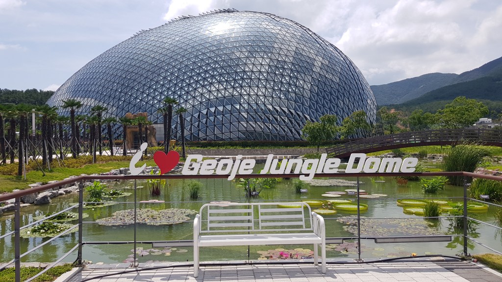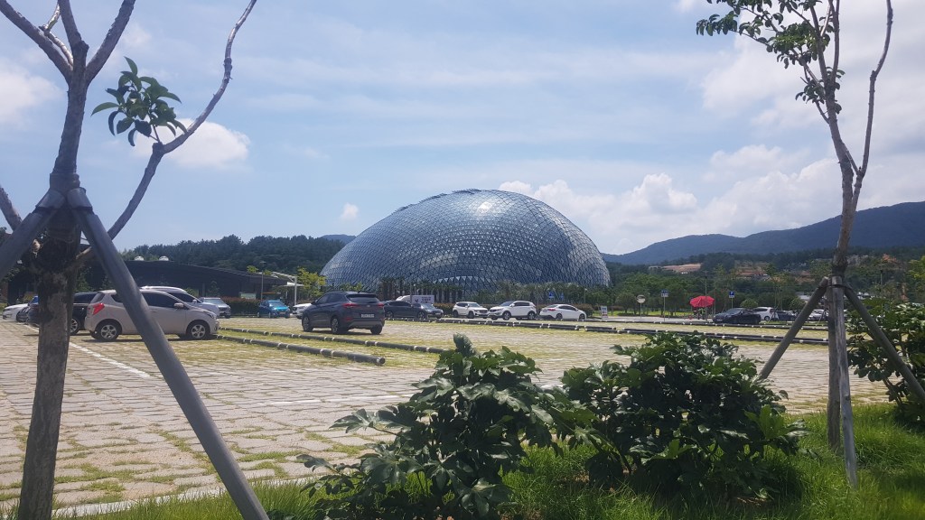 Anyway, our first plan for sightseeing was the Geoje Jungle Dome (거제식물원). This is a big indoor botanical garden set under a giant dome in the country side. We were staying in Okpo on the east side of the island (more on that later), however the Jungle Dome was in the west. As Gohyeon is in the middle we decided to go to the Jungle Dome first to save on travel time another day. Both Naver and Kakao were fine at telling us where to get the bus, just not when it was coming. So we waited at the stop and about 20 mins later our bus arrived. The bus took a lovely scenic route to the Dome, and took about 25 mins in total. When we got off we had about a 15 minute walk to the Dome itself.
