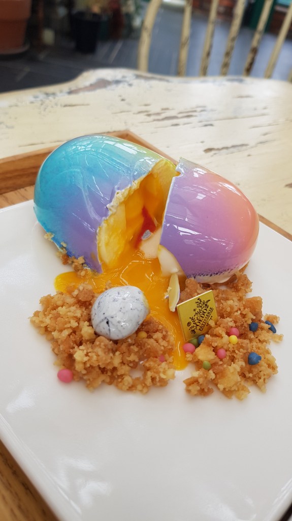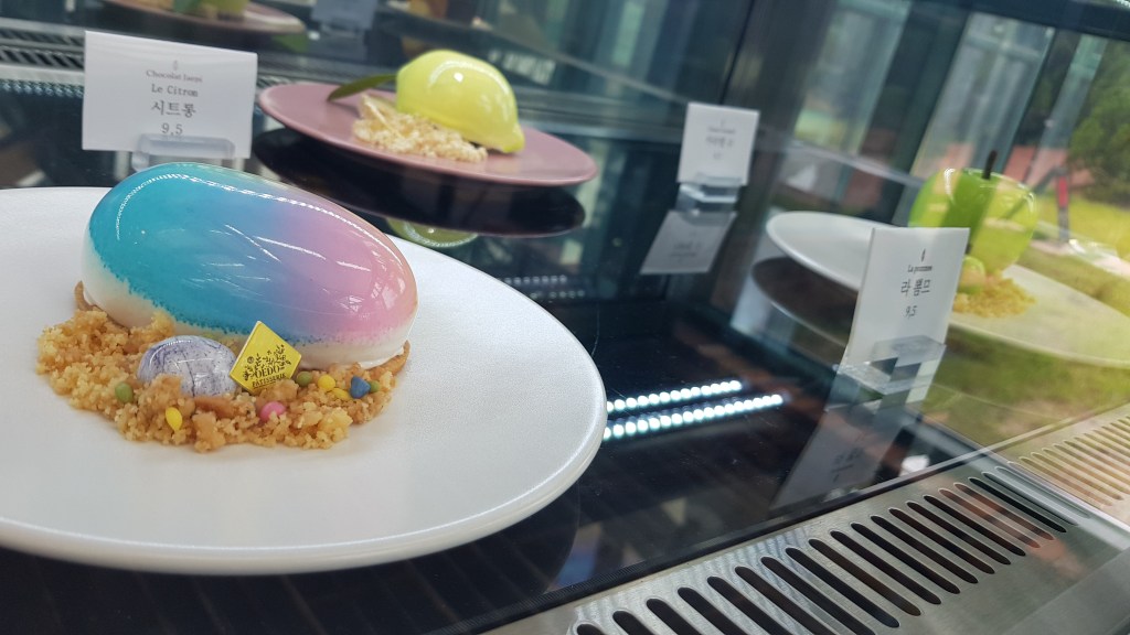 Oedo Nursey has some of the fanciest looking desserts I’ve seen ANYWHERE! They are carefully crafted into all sorts of shapes and designs, and at 10k each while pricey, aren’t rididuclous. We had our hearts set on the cactus tiramisu, but unfortunately they had none available that day 😦 (even more reasons to go back). We instead got a Mondol Rainbow and a Mondol Chocolate. These were the two most exciting looking cakes they had ready, but I mean even the regular cakes were super fancy looking but we wanted to try the special ones! The chocolate one had a chocolate shell and a kind of mousse inside, it was pretty yummy! However, the rainbow one was the best, as when you cracked it open this yellow sweet goo came oozing out. It looked like we’d cracked a dragon egg! It was really delcious too and my favourite of the two we tried. I have no idea what was inside but it tasted good ha!