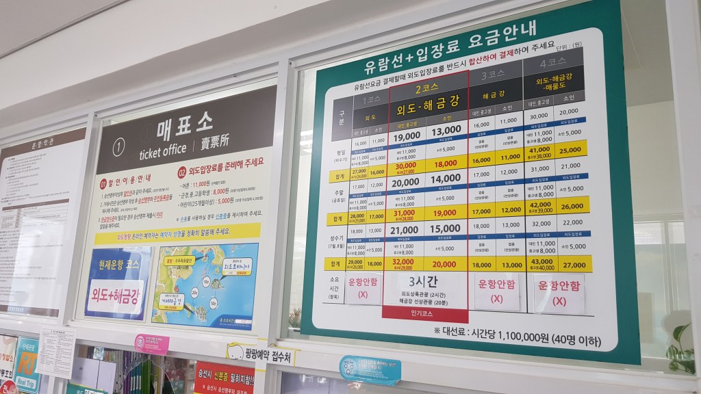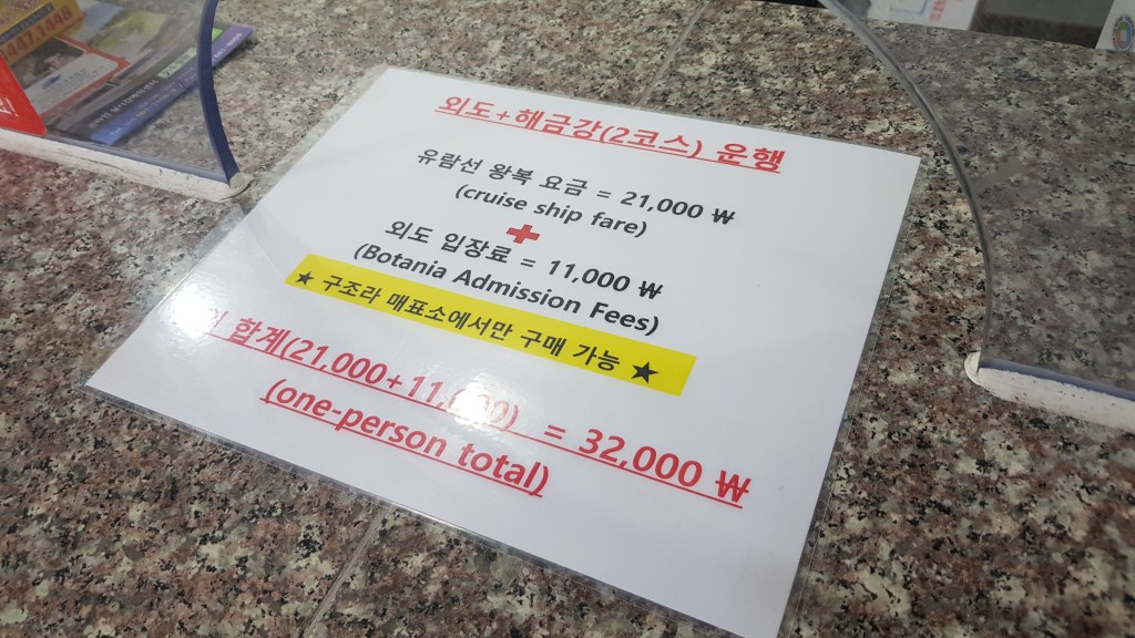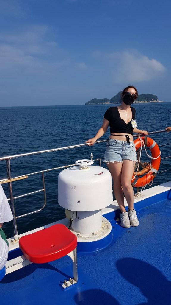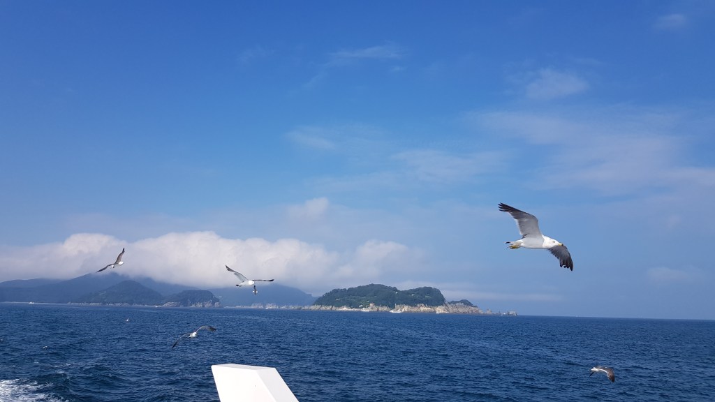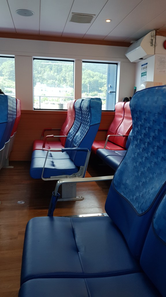 They will ask you to arrive 10 minutes before departure time, and this gives everyone time to get on the boat and got through the safety instructions (all in Korean but they had videos too). The boat was pretty big with ample seating, it had a roof area too that we were allowed to go up to several minutes after setting out. If, like me, you are prone to seasickness I would recommend getting some medicine in advance. They sell it on the boat for 1,000 a bottle but I got some at the pharmacy before hand for 500. While the boat ride wasn’t too rough there were odd moments that upset my stomach a bit! You can ask for 멀미약.