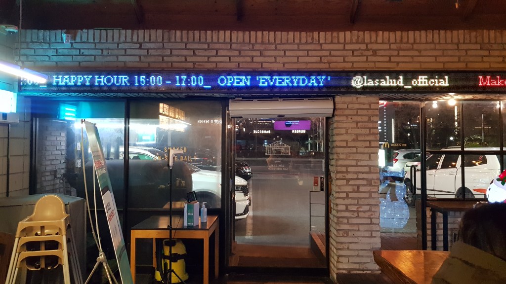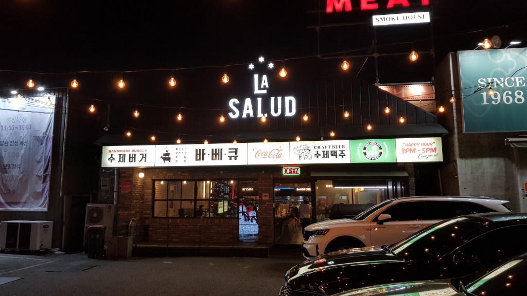 So here I was thinking that EVERY foreigner in Daegu had heard of La Salud, it’s the go to restaurant for so many of my friends I just assumed everyone had been there. So imagine my surprise when I was chatting to someone who’d been here almost a year and NEVER heard of it! To be fair though, I only went for the first time last winter, and got the chance to finally go again this past weekend, so I’ll let them off this time ;p But it made me think I should add this foreigner hotspot to the blog in case there were others out there who hadn’t yet been to this yummy American BBQ joint right by Suseong Lake!