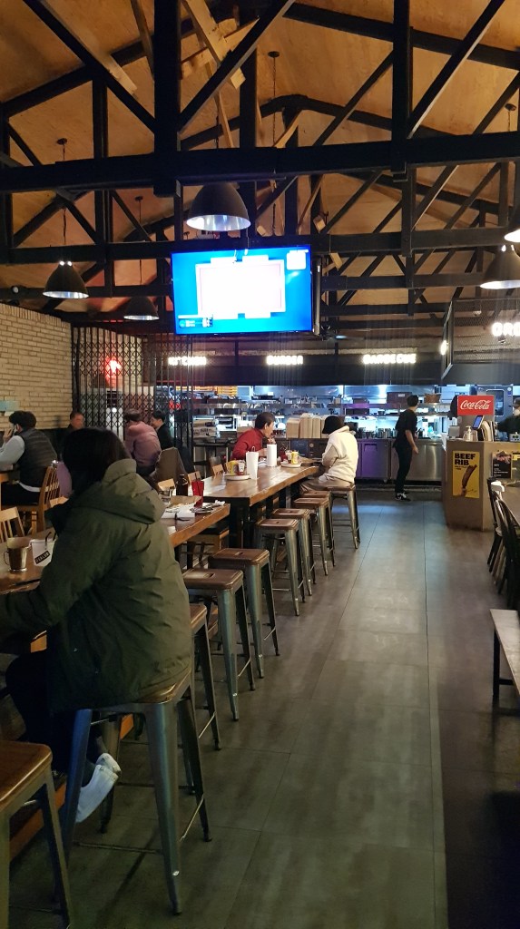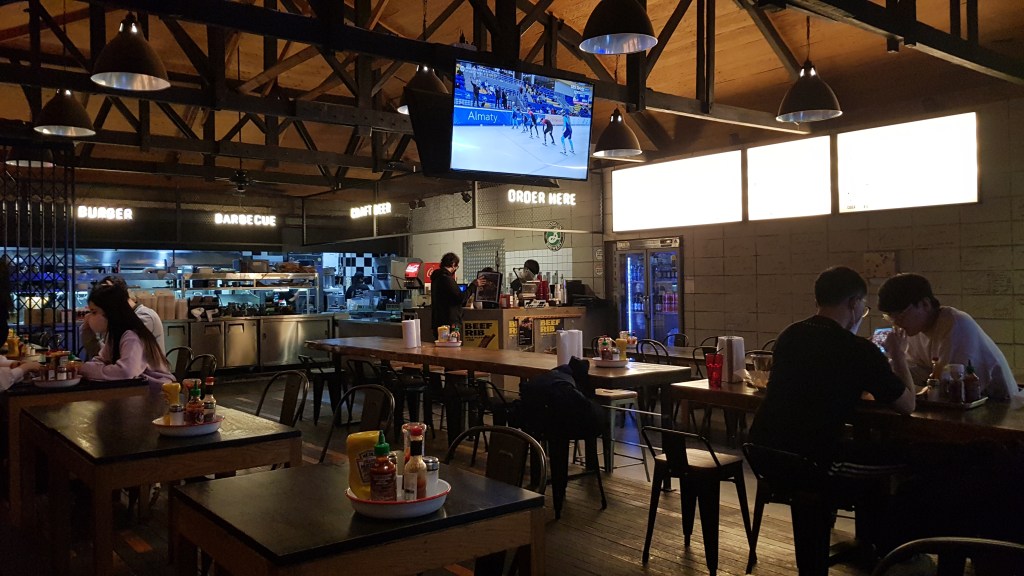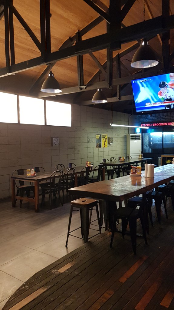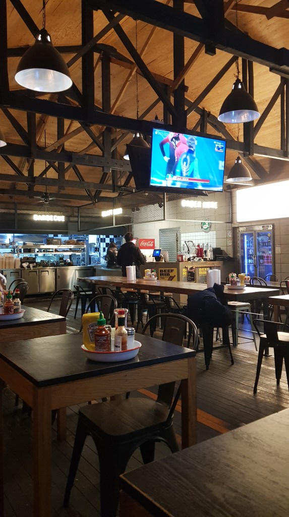 Inside is American themed (I’m assuming, what do I know though I’m British) with ample seating so you can usually find a spot even on busy days. They have big TVs set up too which have always been showing sports when I’ve visited. So when you walk in choose a spot to sit in and grab a menu. Place your order at the bar when you’re ready and pay in advance.