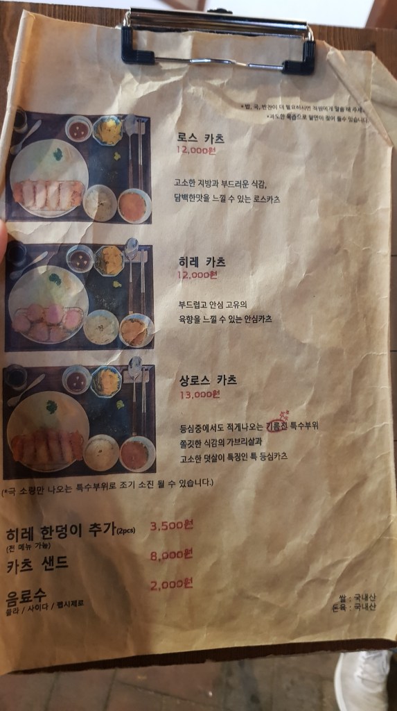 We knew it must have been busy that day as when we came to order they told us they only had one menu item left avaiable. Normally they offer three different types of donkas, but on this occassion they only had the 안심 (tenderloin) left. The price is 12,000 for one. This was fine by me as that was what I wanted anyway. They also have a couple of sides, you can order an extra side of tenderloin donkas (3,500) or a donkas sandwich (8,000). The menu is very limited but if all you’re after is donkas then it has you covered haha!