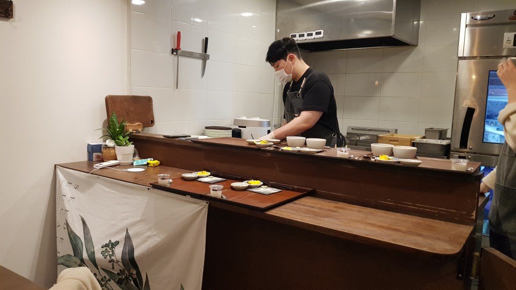 The restaurant is located just a short walk from Banwoldang Station, exit 10. Word of warning, we went on a Tuesday night and it was packed out. We were a group of 6 and hadn’t made a reservation. (I’m not even sure if they take reservations). Luckily a table of two had just left, and they asked another party of two to move to a smaller table. So we didn’t wait long but as the store is very small we had to sit seperately. No one minded though as we were all just hungry after work haha!