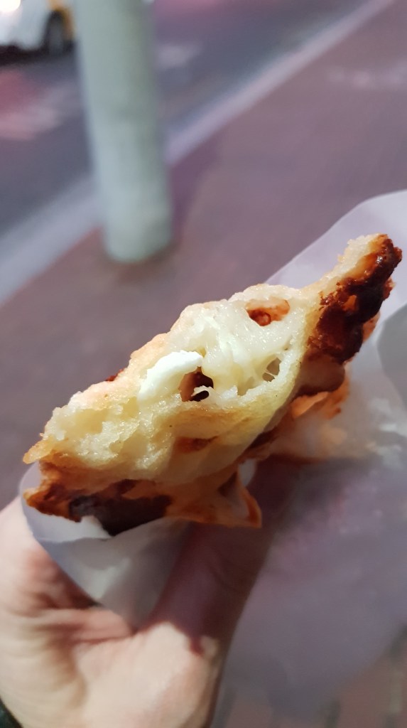 So imagine how happy I was to stumble across this street cart that doesn’t only do red bean and custard cream, but also SEVERAL OTHER FILLINGS and is only 2 stops from my house??? AHHHHHHH. EXCITE!!!!! This little street cart offers more exciting fillings like cheese, pizza, sweet potato, apple, kimchi, and peanut butter!!!!!