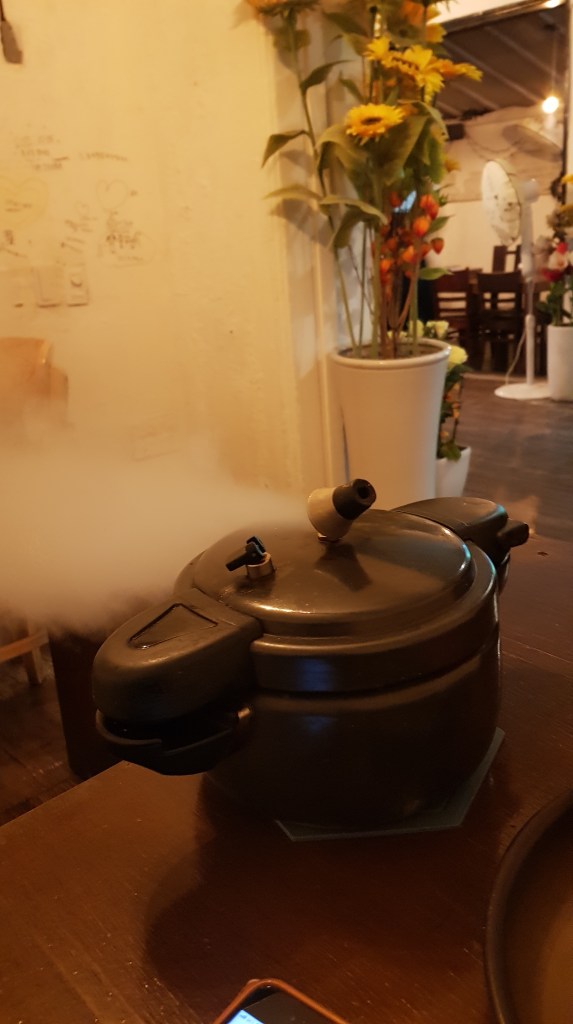 Once your food is ready they bring the pressure cooker out to the table. It’s fun because you get to watch all the steam blow out! They then pour everything into a big sharing bowl in the middle and chop up the meat and kimchi for you. If you like smaller bite sized pieces don’t worry, they leave the scissors for you. Then just dig in! Because of the way it’s cooked the meat is so TENDER and melts in your mouth. I also love mixing the kimchi stew in with the rice and egg, DELICIOUS. It’s perfect food for the winter too, that stuff will warm your soul.