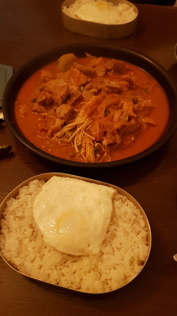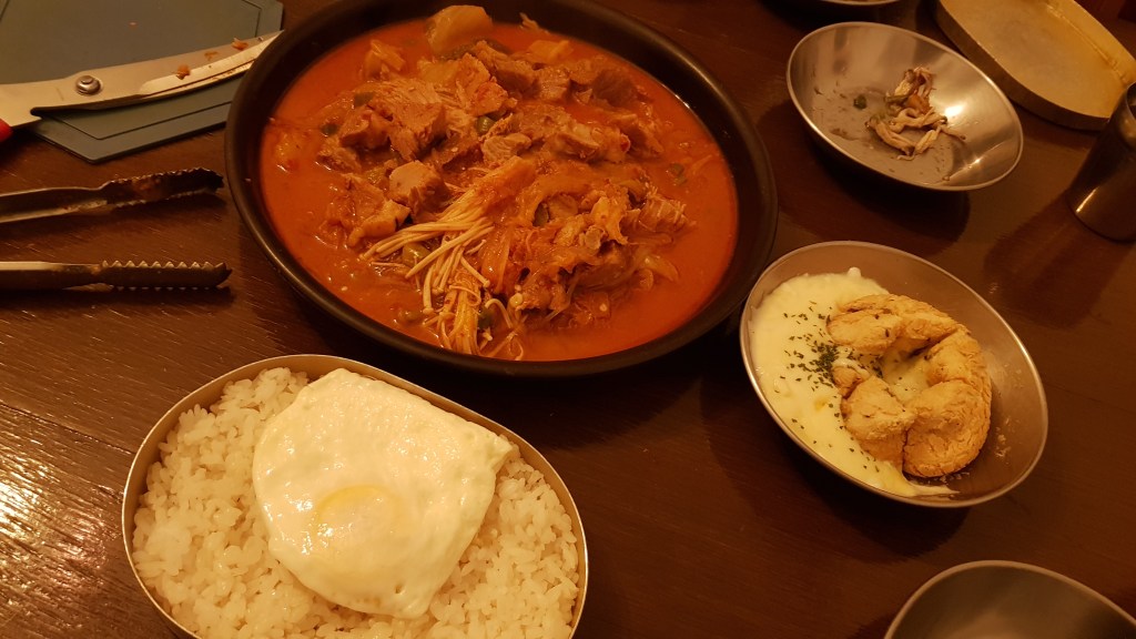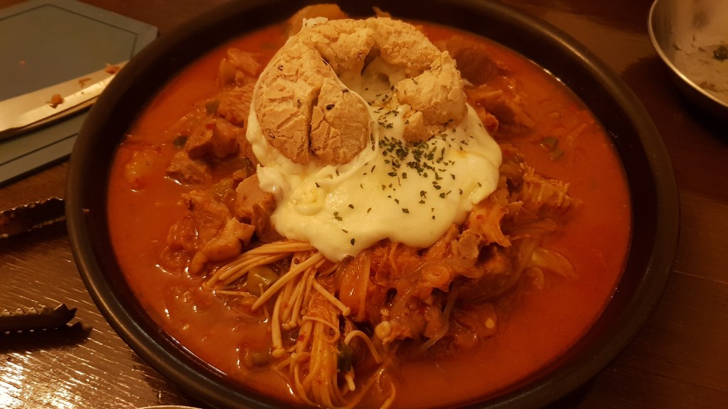 The main menu item here is the pressure cooker kimchi stew. You can choose from different meats to add as the main, pork belly 9,500won (오겹살), pork neck 9,000won (목살), or fish 9,000 (꽁치 – I think this is a kind of mackeral??? Not 100% sure lol). I usually go for the pork neck as I prefer a less fatty cut of meat. Prices listed are per person and each one comes with a portion of rice and a fried egg included. They also do a pork soup main 9,000. They also offer a range of sides, but my fave is the cheesy bread topping 4,900 (치즈미니빠네). They bring some banchan (mini sides) and you can refill these as much as you want from the self-serve bar, just save room for the main!