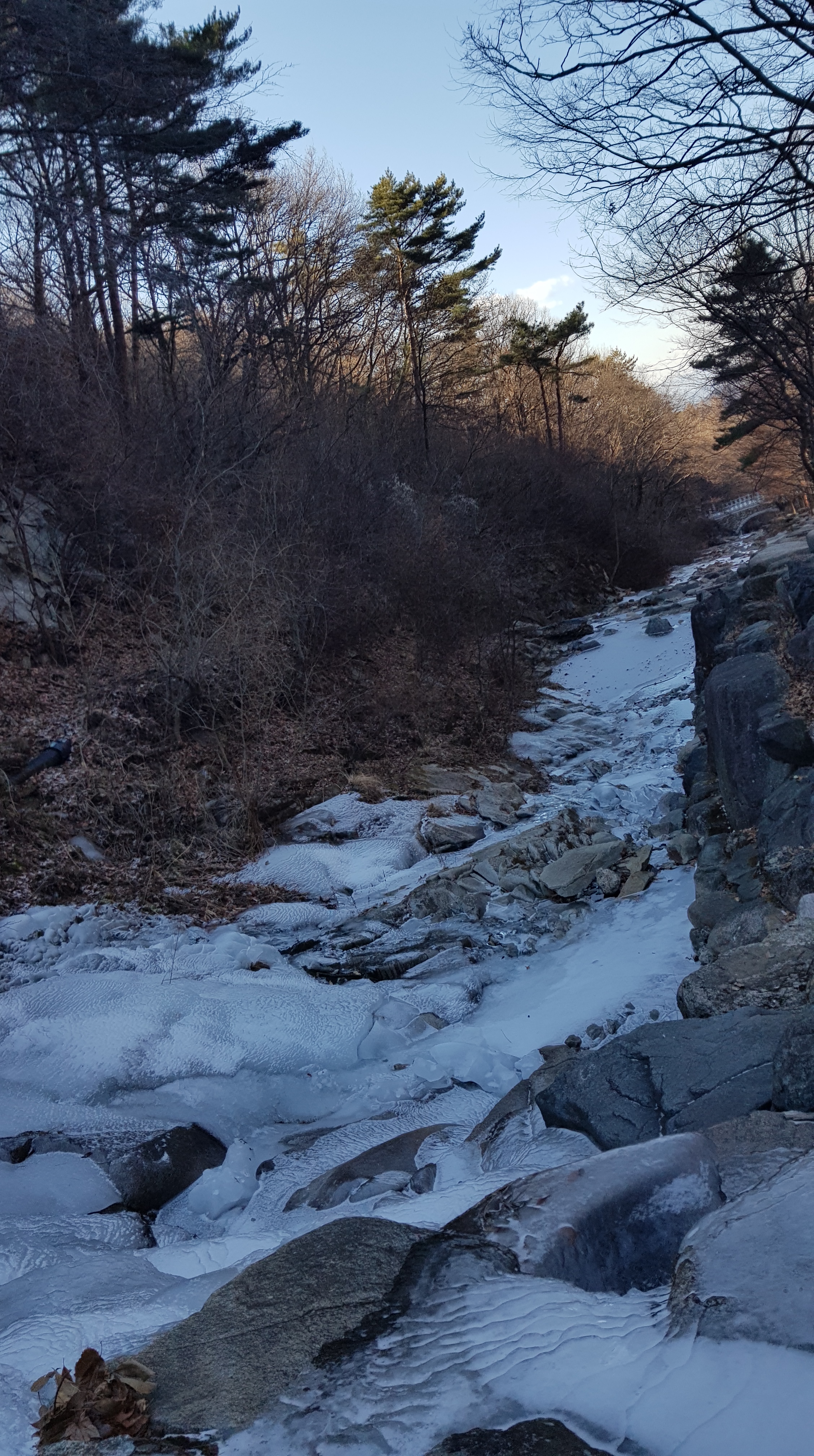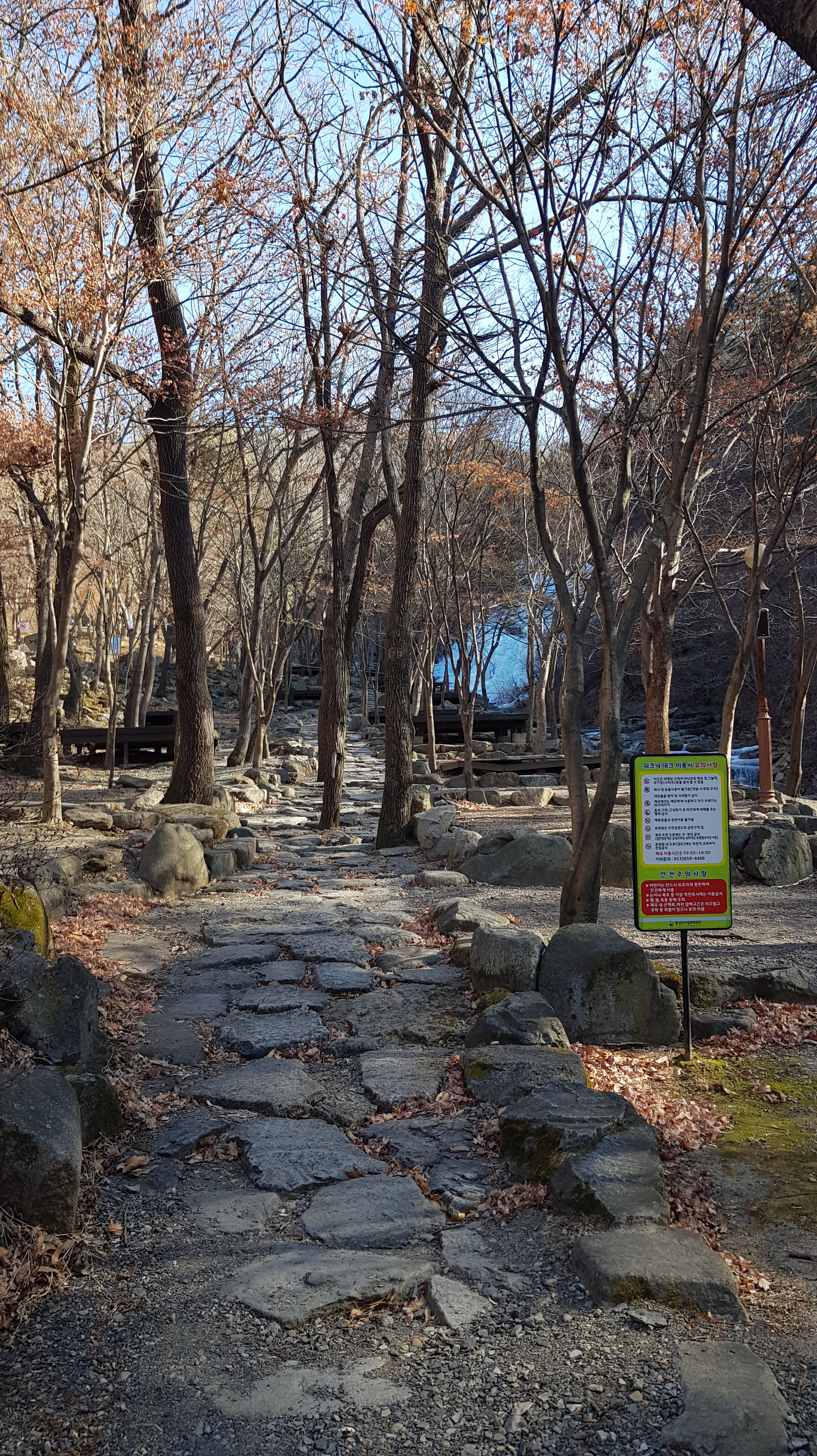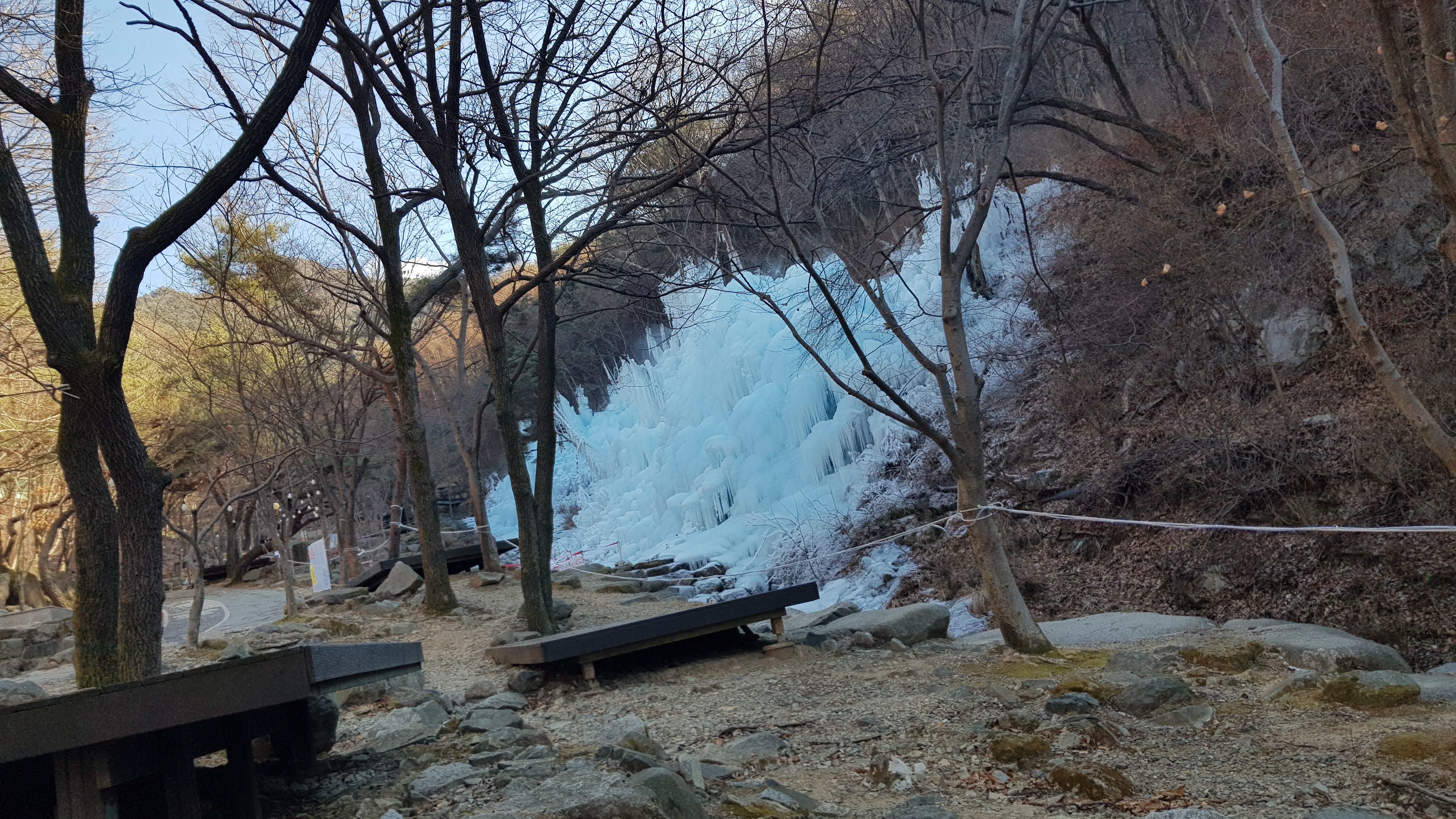 The wall itself is pretty big and impressive! Sadly it is manmade, look closely to see the sprays installed at the top. But it’s still pretty and when we went the stream was frozen too making for nice views on the walk up. The whole area has been taped off, but after watching for a few minutes we saw mannnnyyyyy Korean hikers duck under the tape for pics so we decided to do the same haha. WARNING: it was pretty slippery so wear sensible shoes and enter at your own risk. The tape is there for a reason!