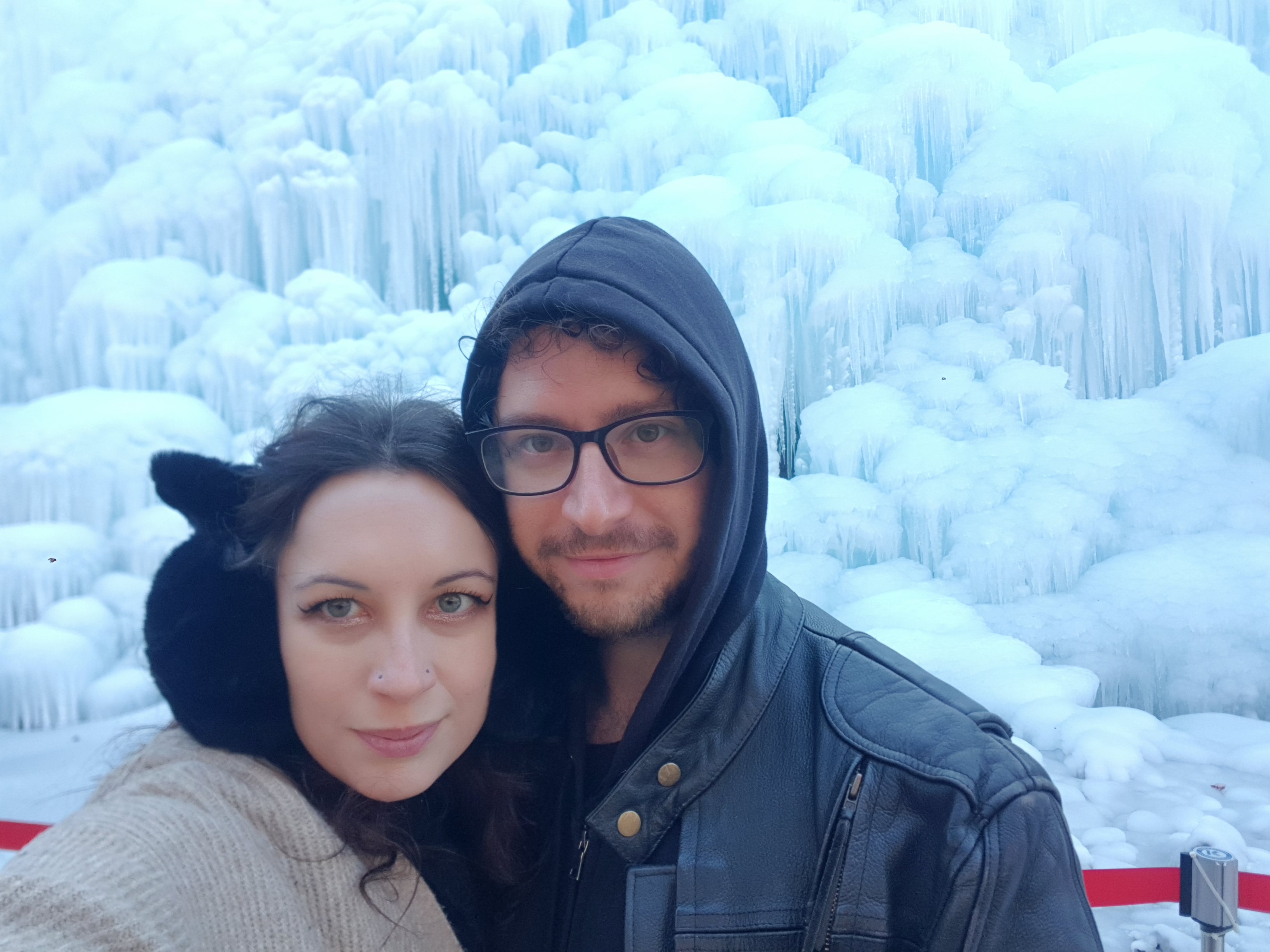 Once you reach Hotel Azalea you want to continue walking up the road and higher up the mountain. You’ll notice a toll booth on the way, and this is why getting off at the Hotel works out cheaper. Don’t need to pay the toll! After the toll booth you will start to see signs for the ice wall that look like the one pictured below. It was a pretty easy walk and not hard to find, just stay on the main path. Eventually you will reach the tall statues and a bridge. If you look to the right you can see the ice wall and the path to walk up to it. From the Hotel it took around 10 mins to reach the wall.