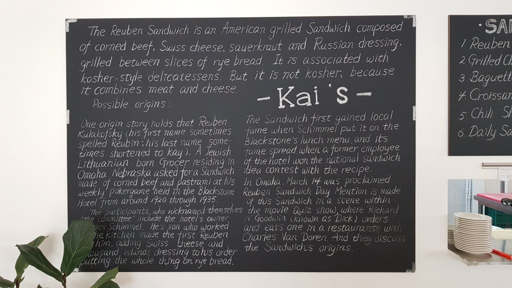 The outside is easy to spot with the modern white signage with cute lettering. Inside also has a fresh and modern feel, there are plants hanging from various corners and wine bottles along the walls. How European lol. The furnishings are all wood and surprisngly comfy! With how busy this place is it wasn’t easy to get photos but I did my best, you can at least get a feel for the vibe there. Also, check out their sign board for information about the history of the reuben sandwich. It’s not always easy to get a reuben here so if you’re craving one def check out this place!