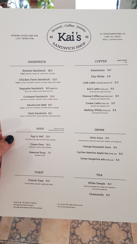 Hi everyone! I’m back today with a recommendation for a yummy sandwich shop located a short walk from Banwoldang Station. I don’t know about you but I LOVE a good sarnie, and this place is perfect for a spot of brunch any day of the week. Get there early though, as while Kai’s is open from the super early (for Korea lol) 8am, last orders are at 5. This place can get PACKED, so plan ahead to get there before the lunch rush!