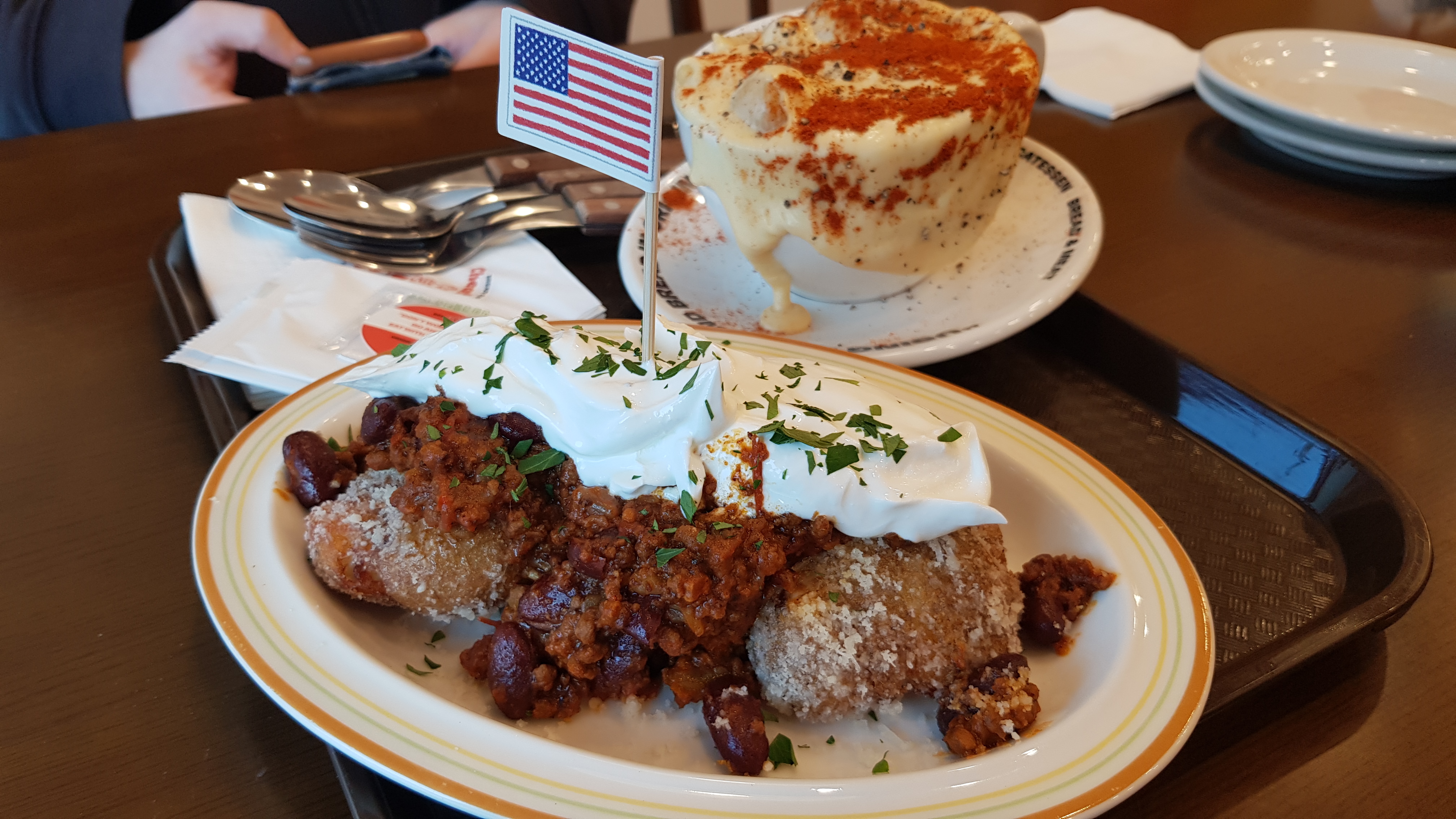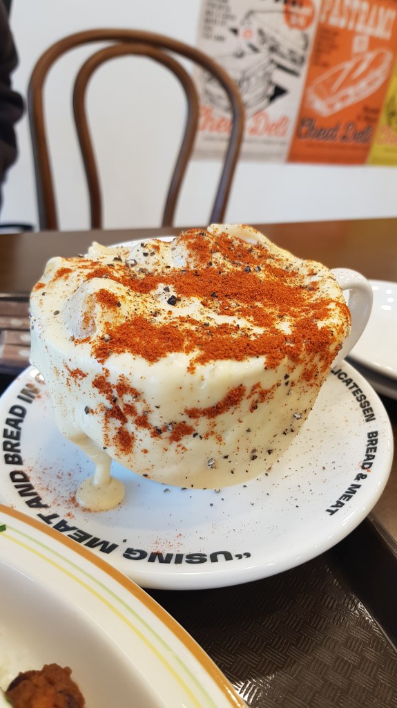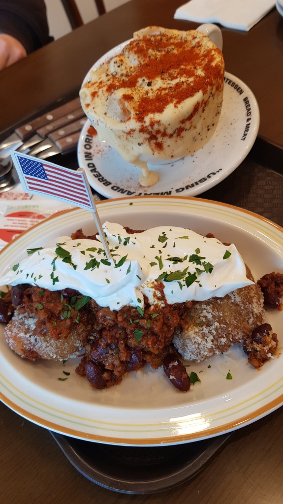 The food was absolutely delicious, and they get 5 stars for presentation too. I thought the little flags were a cute touch. The sandwich bread was crisp and the deli meats were all declious. Plus the pickle was huge if you’re into pickles (I hate them haha). The chilli con carne was served on potatoes and was suuuuper yummy, it came with huge dollops of sour cream too which I very much appreciated. The mac and cheese was the main dish I had wanted to try, after seeing the pics online. It was served in a mug (A+ for aesthetic) and was incredibly rich and cheesy.